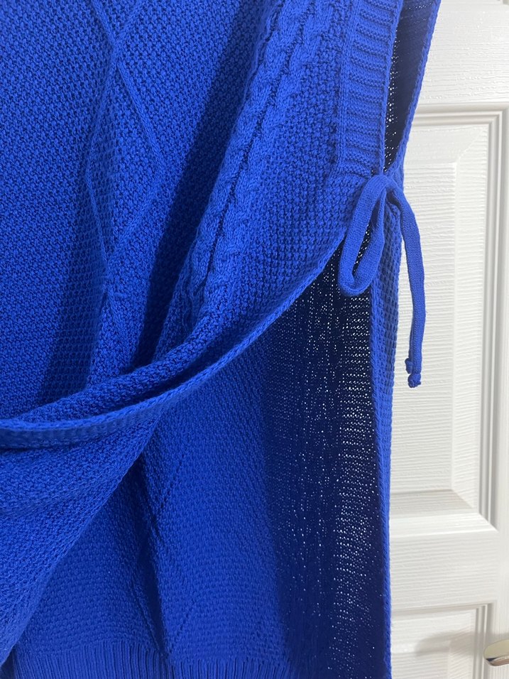 Mavi renkli, bohem tarzda, örgü kadın süveter. Balıkçı yaka ve askılı kol detaylarına sahip, rahat kesimli ve midi boyda, şık ve konforlu bir parça. standart beden hic giyinilmedi mağazadan alındığı icin etiketi yoktur