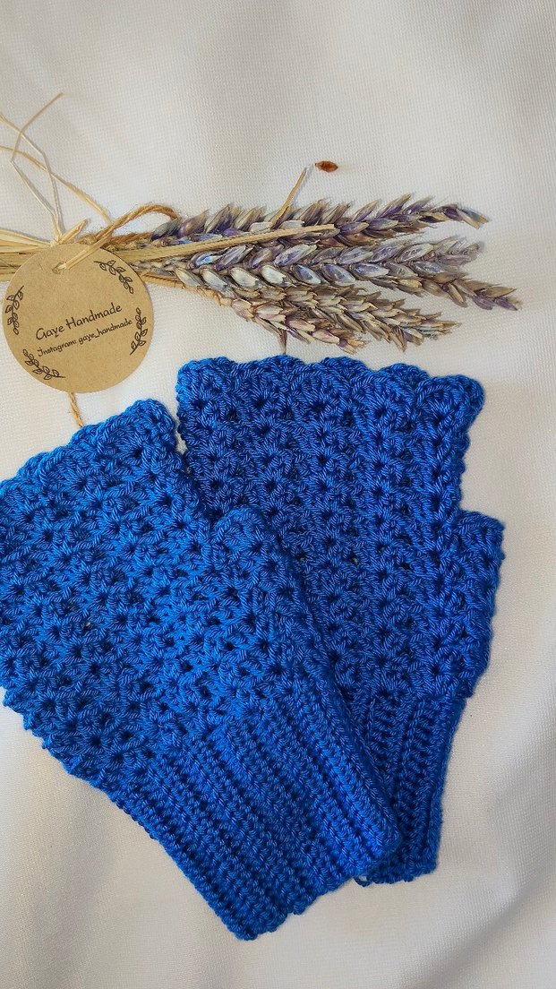Mavi renkli, bohem stilde örgü parmaksız kadın eldivenleri. Rahat ve renkli tasarımıyla retro ve hippie tarzına uygundur. GayeHandmade markası ile gönderilecektir. standart boyutta ve dar örülür kullandıkça genisleyerek tam elin kalıbını almaktadır .
