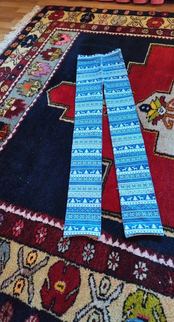Örme, uzun boylu ve renkli mavi desenli, yumuşak ve sıcak dokulu, bohem tarzına uygun kadın pantolonu.