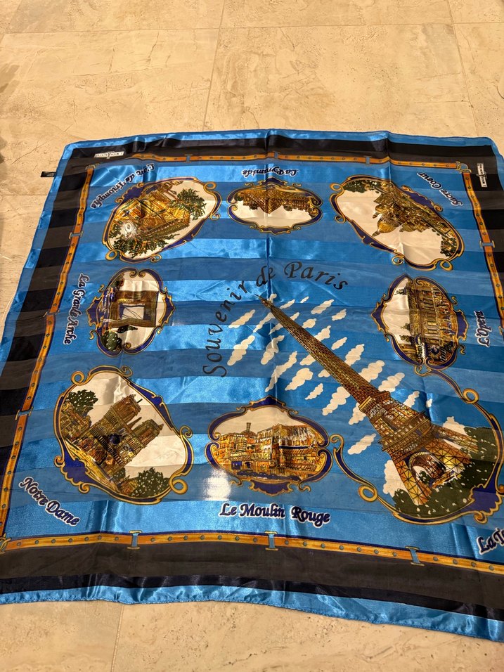 Mavi ağırlıklı fular, bohem tarzda Paris simgelerini drapeli şekilde sunar. Retro ve hippie havası katar. Ölçüleri 1*1 metre. Paris’ten satın almıştım.