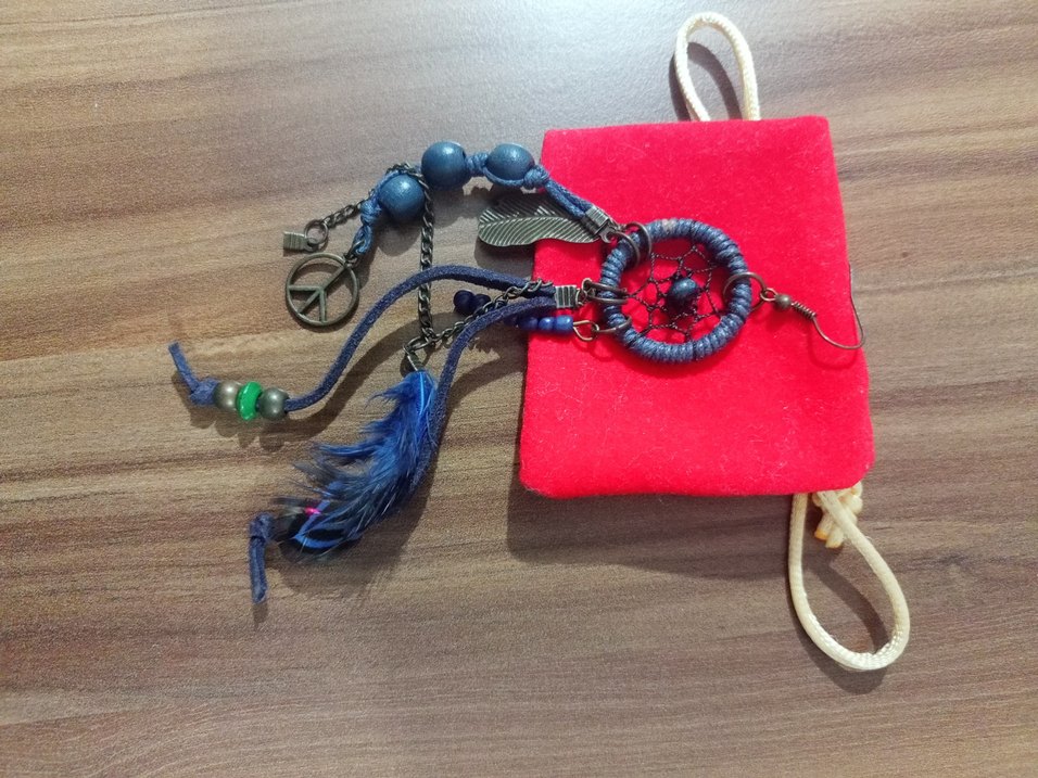 Püsküller, boncuklar ve tüy detaylarıyla renkli mavi bohem tarzında küpe. Retro dokunuş katar.