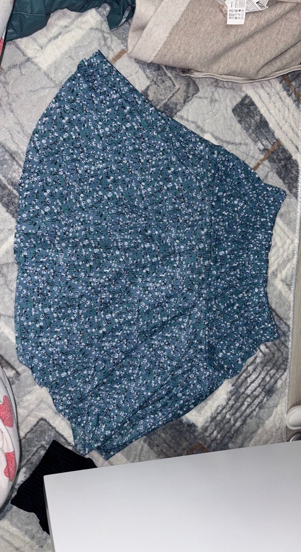 Sentetik kumaştan, bol kesim ve volan detaylı, hafif batik desenli mavi bohem şortlu mini etek. Dış mekan kullanımı için uygundur.