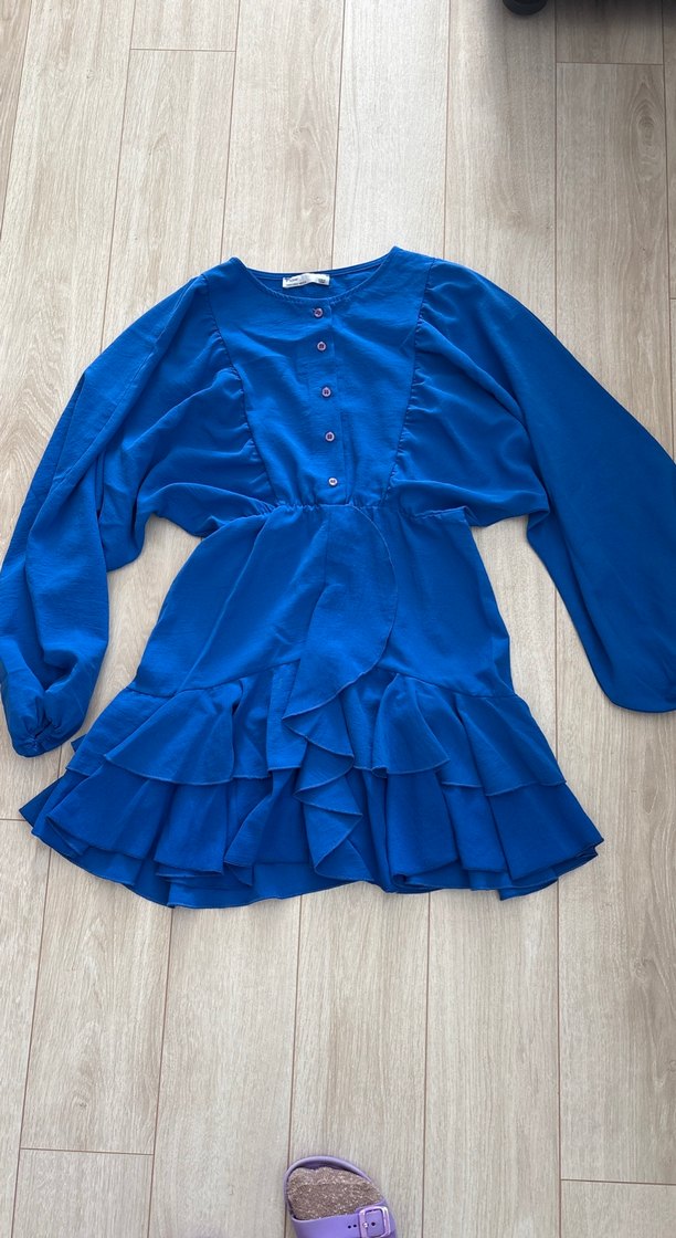 Mavi, bol kesim, uzun kollu kız elbisesi. Yumuşak keten kumaştan, bohem tarzında, robalı detaylara sahip.