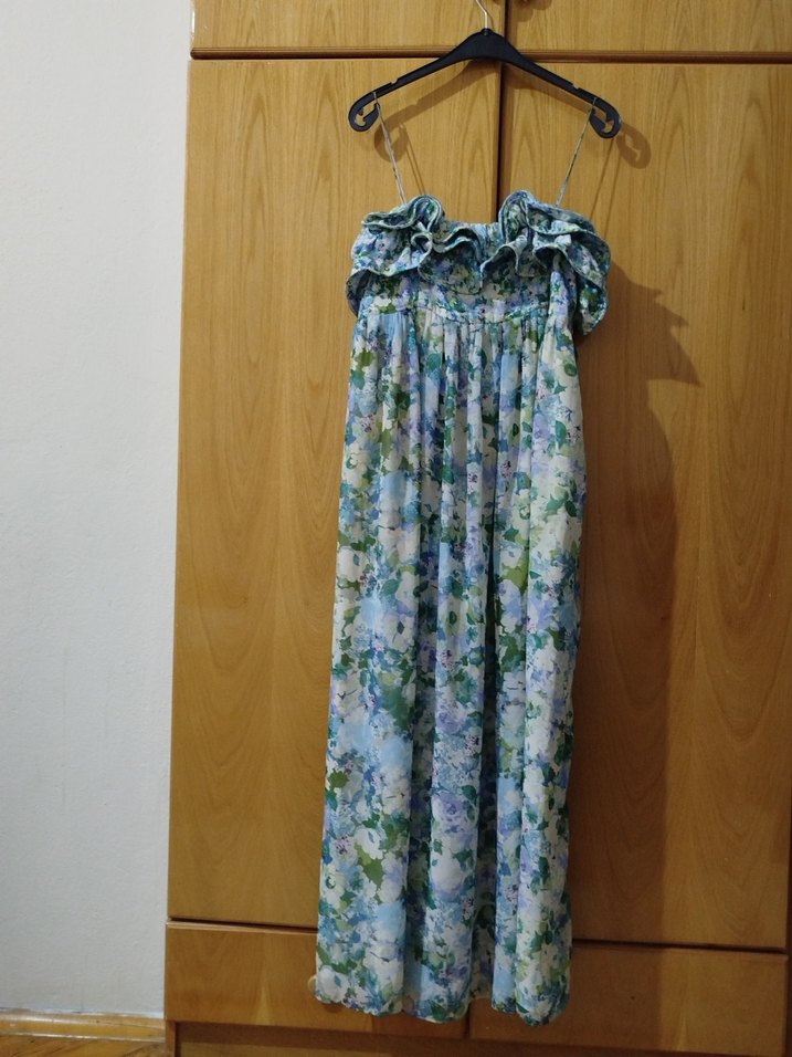 Bohem tarzda, mavi pastel tonlarında tie-dye desenli, askısız ve dökümlü yakalı uzun elbise. Rahat ve hafif sentetik kumaştan yapılmıştır.