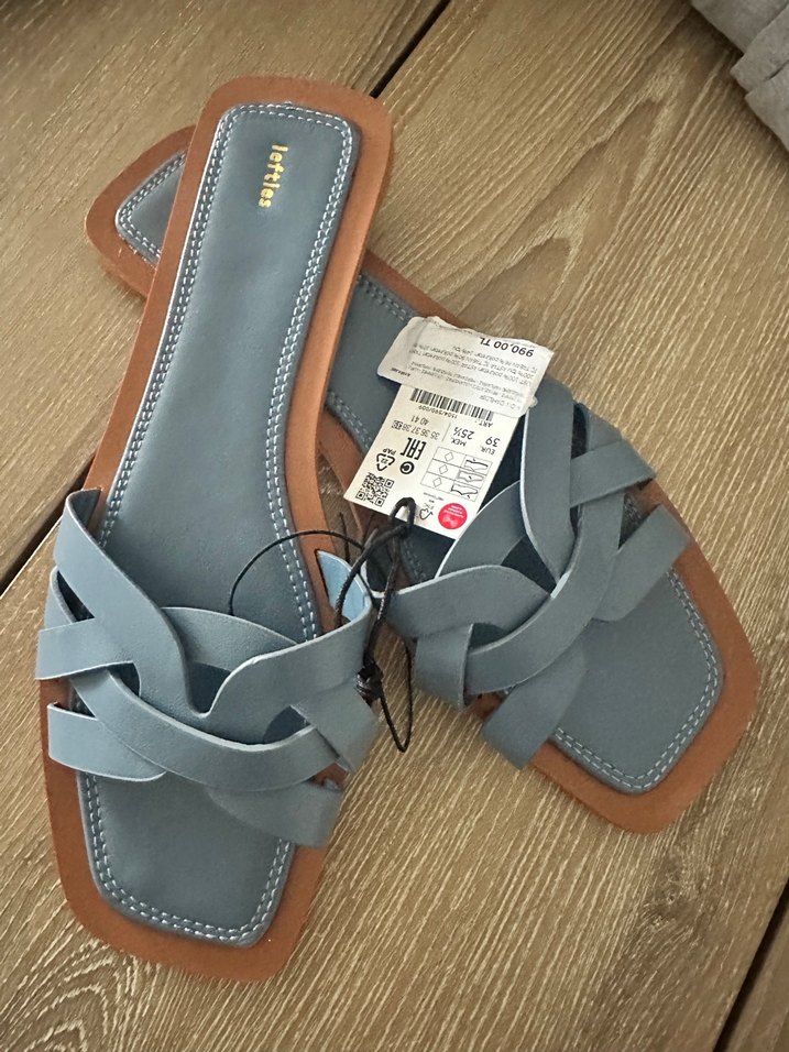 Mavi renkli, örgü model kadın terlik, dış mekan kullanımı için uygundur. Tabanı dayanıklı kauçuk malzemedendir. Sıfır etiketli duruyor. Lefties marka seçeneklerde yok, zara gruba aittir