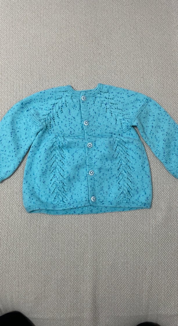 Renkli mavi, bol kesim, uzun kollu ve düğmeli ön kısmıyla bohem tarzda örme kız hırkası. Yumuşak örme kumaştan üretilmiştir. 4-5 yaş