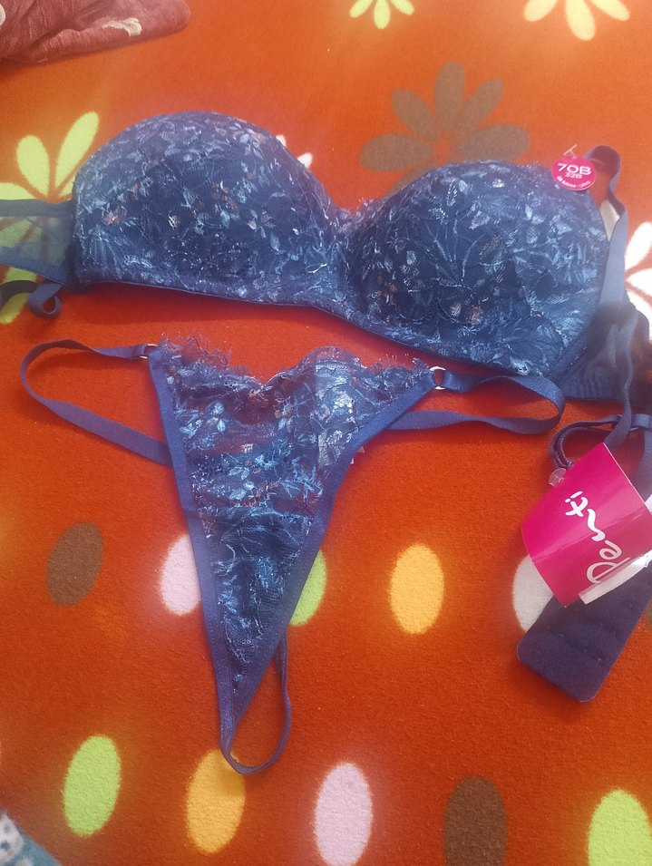 Mavi bohem tarzda, destekli, çiçek desenli dantel sütyen ve uyumlu tanga seti, rahat ve şık bir görünüm sunar. hiç kullanilmadi sütyen 70B,32 beden dik tuma özelliği var