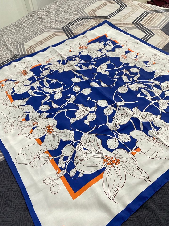 İpek dokulu, koyu mavi zeminli, beyaz çiçek desenli ve turuncu bordürlü, bohem tarzda kadın eşarp