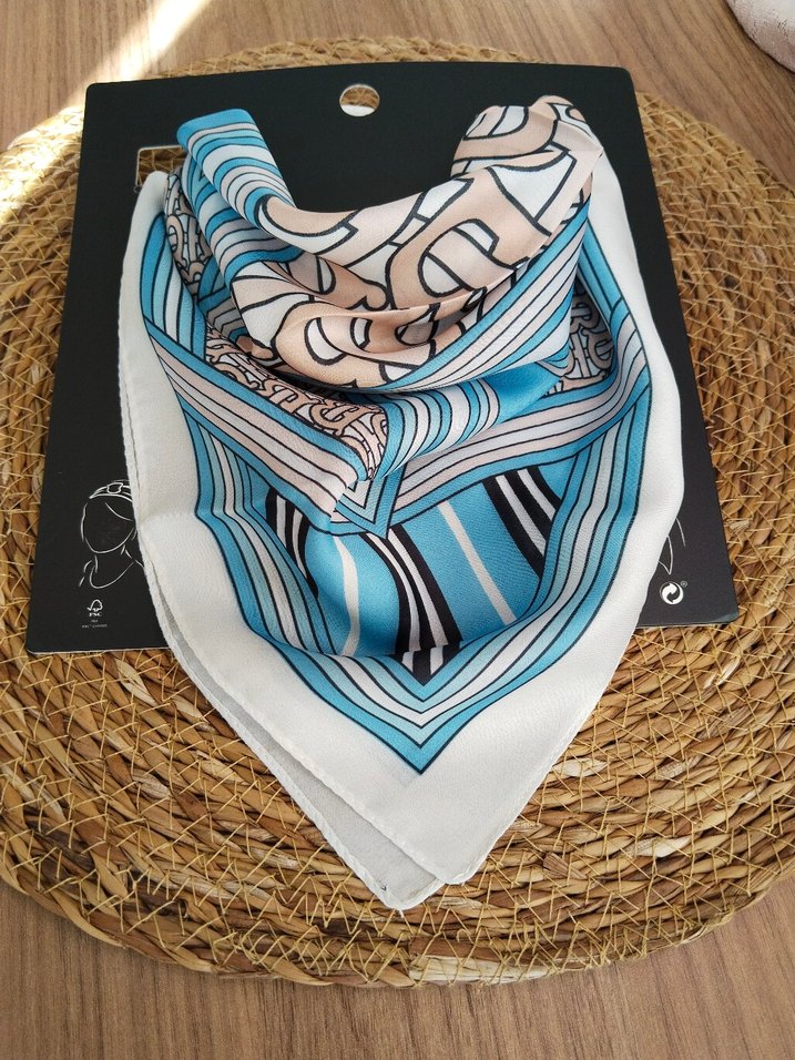 Hafif mavi ve bej tonlarında, bohem desenli, yumuşak vual kumaştan drapeli kadın fular. Retro ve hippie tarzları için uygundur.