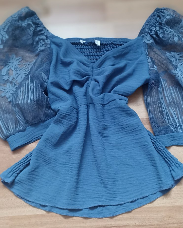 Mavi , bol kesim, drapeli ve balon tül kollu straplez bluz. Midi boyda, romantik akşamlar için uygun. butikten almıştım
