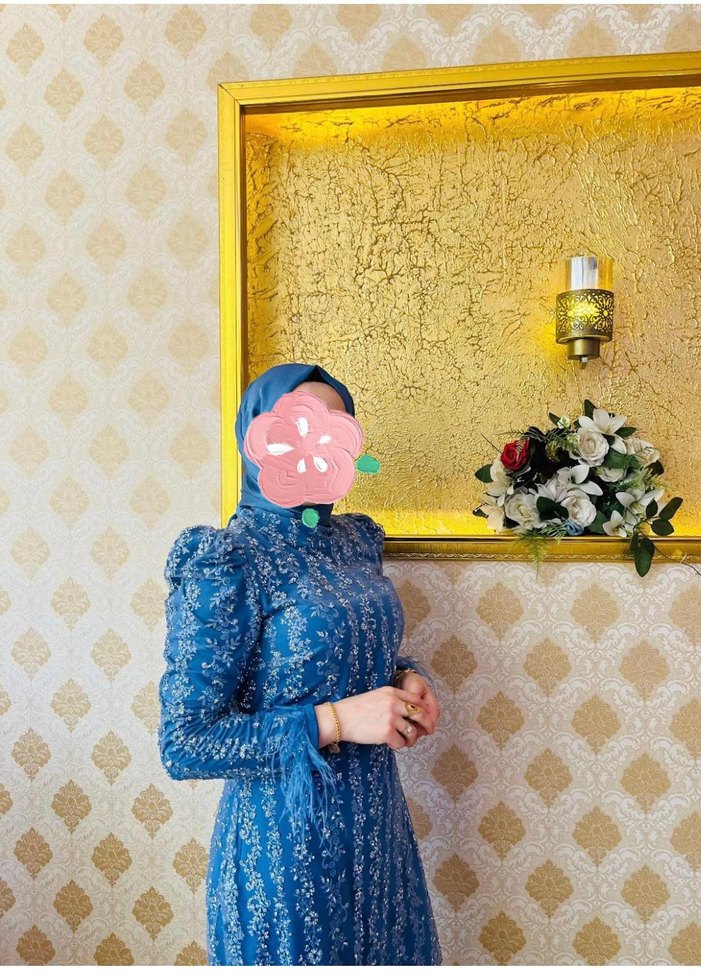 Mavi, yüksek yakalı, uzun kollu, drapeli ve bağlama desenli, bohem tarzda uzun, dar kesim abiye elbisedir.