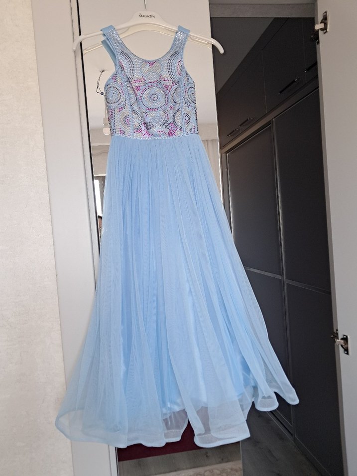 Mavi uzun abiye elbise, baskılı drapeli gövde ve salaş etek ile, düğünler için uygun bohem tarzda.