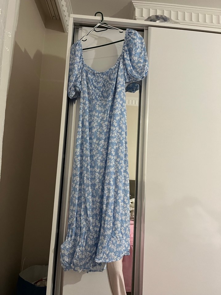 Mavi pastel tonlarda, pamuk kumaştan yapılmış, straplez yakalı ve balon kol , bohem tarzda uzun ve bol kesim elbise. Salaş ve dökümlü yapısı günlük kullanım için uygundur. Özel gün için 2 kere kullanıldı