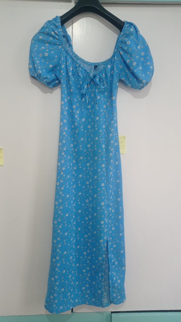 Mavi bohem elbise, bol kesim, kısa balon kollu ve düğmeli V yaka tasarımıyla dikkat çekiyor. Pastel tonlarda tie-dye deseni ile vintage havası yaratır.