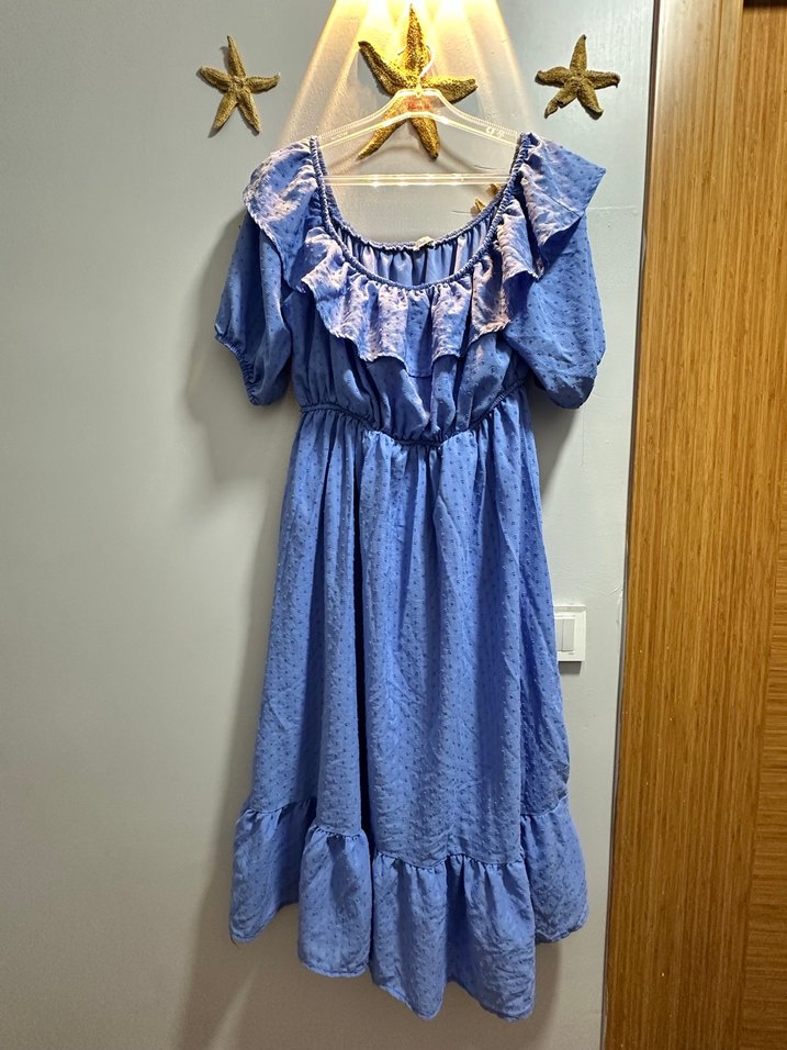 Mavi bohem uzun elbise, fırfırlı yakası ve bol kesimiyle yumuşak sentetik kumaştan üretilmiştir. Kayık yaka ve askılı kollara sahiptir, hafif batik desenlidir.