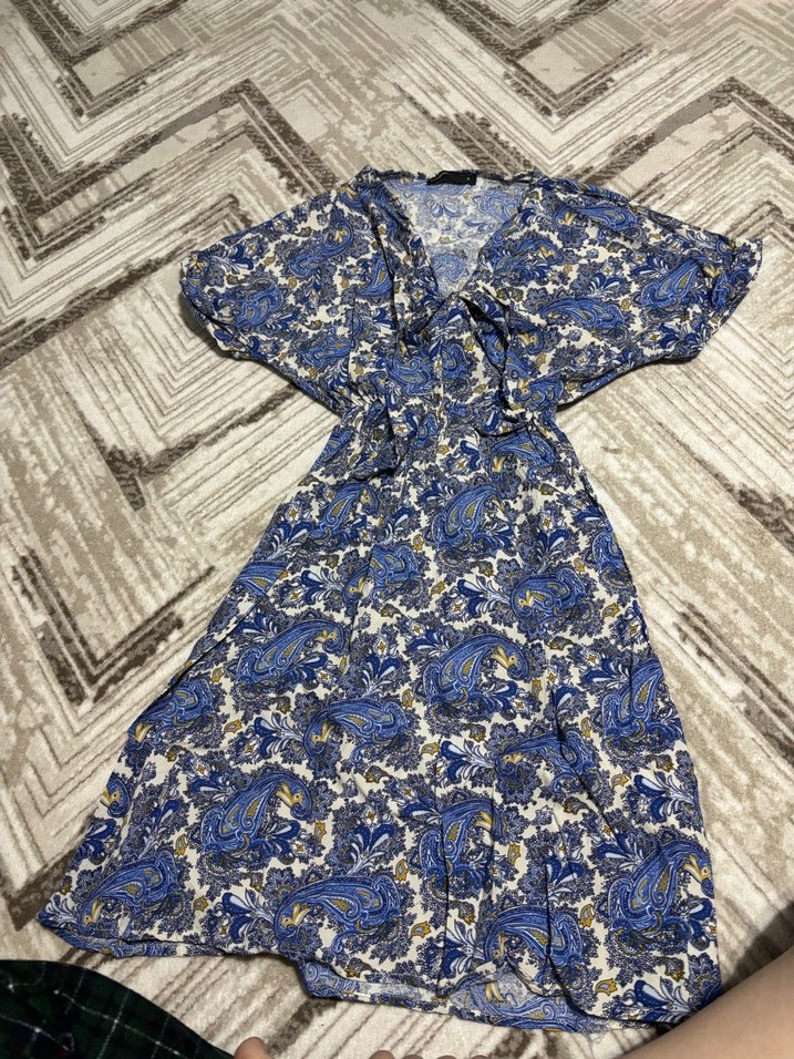 Mavi renkte, sentetik kumaştan uzun, bol kesim, kısa kollu, V yakalı ve drapeli bohem elbise. Günlük kullanım için uygun.