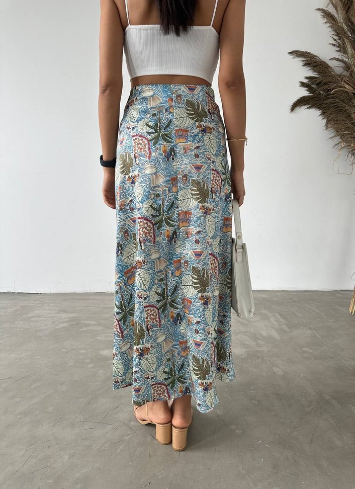 Mavi uzun etek, bol kesim ve drapeli tasarıma sahip. Canlı batik desenleriyle, yumuşak sentetik kumaştan üretilmiştir.