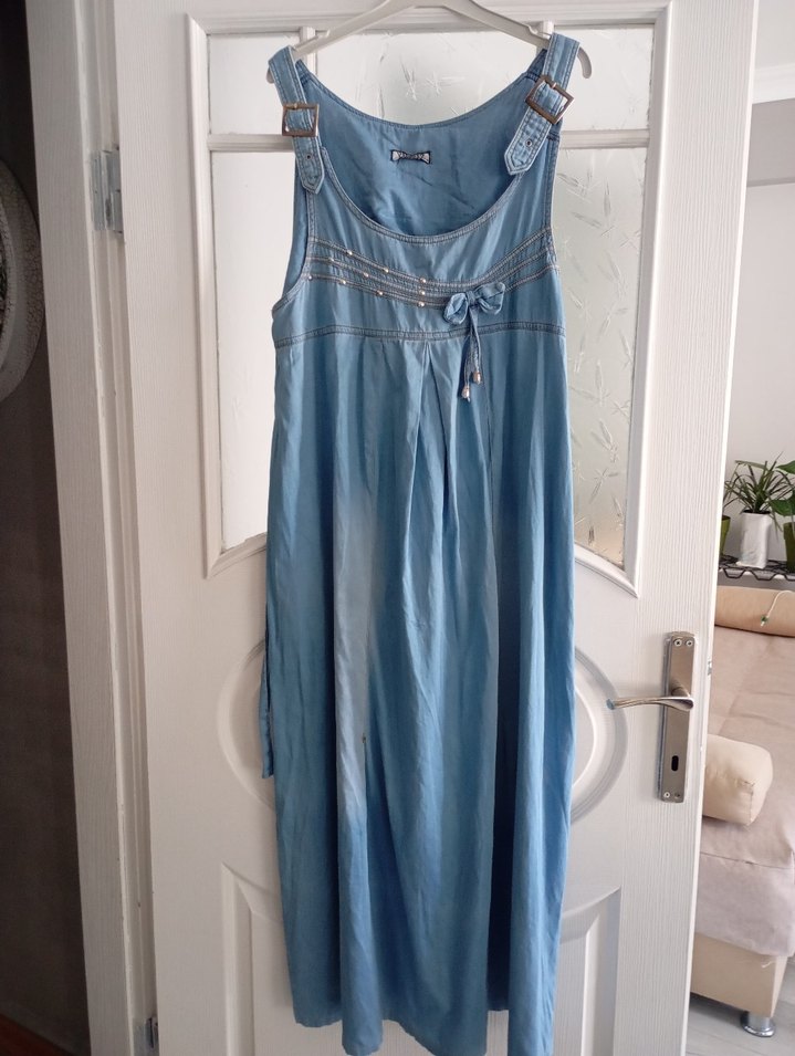 Bol kesim, uzun boy hamile kot elbise, drapeli detaylı ve ayarlanabilir askılı. Pastel mavi renk, bohem tarzıyla uyumlu.