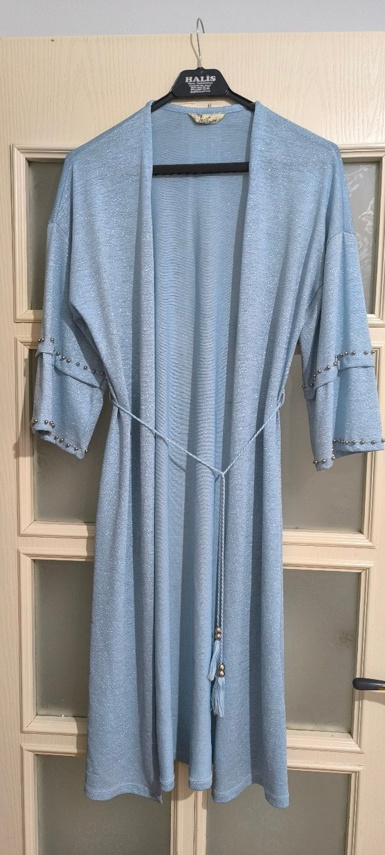 Pastel mavi renkte, bol kesim ve uzun boyda kadın sabahlık. Bohem tarzı, askılı kollar ve kol detaylarında boncuk süslemeleri bulunur. Bağcıklı model, rahat bir görünüm sunar.