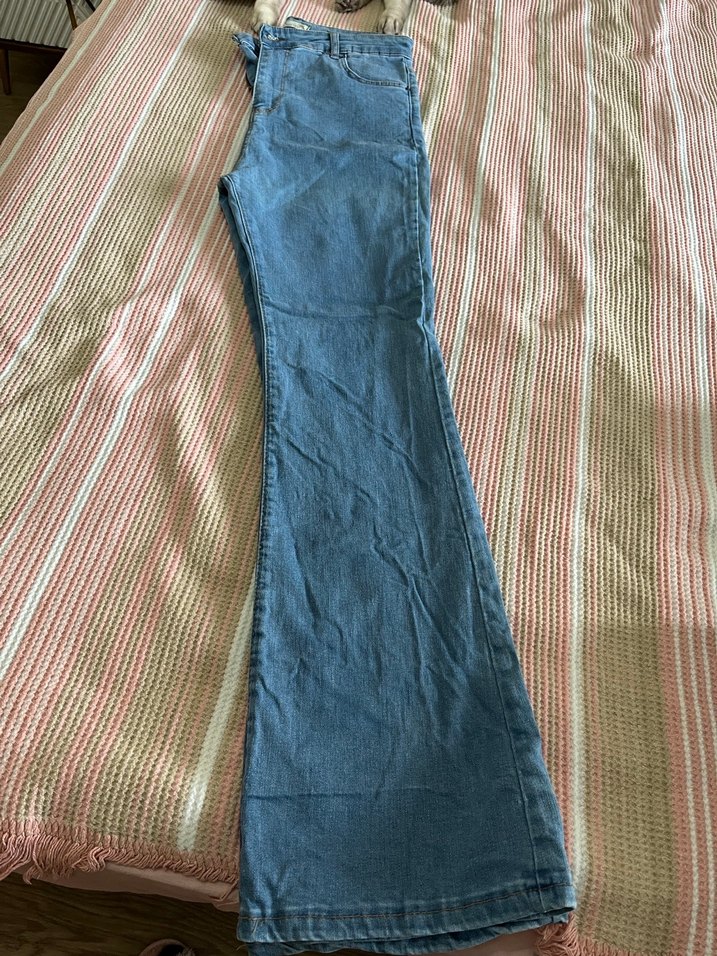 Pastel mavi kot pantolon, regular kesim ve drapeli tasarıma sahip, bohem ve günlük rahat tarzı yansıtıyor.