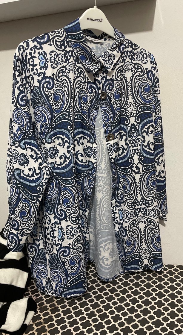 Mavi ve gri bohem desenli, uzun kollu, düğmeli ve yüksek yakalı kadın gömleği. Rahat ve bol kesim, günlük kullanım için uygundur.