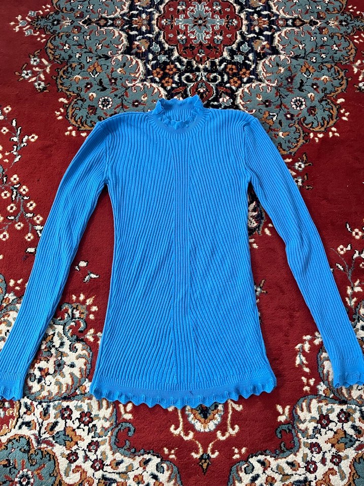 Mavi renkli, uzun kollu, boğazlı, triko, bohem tarzda, rahat ve renkli desenli, günlük kullanıma uygun fitted kazak.