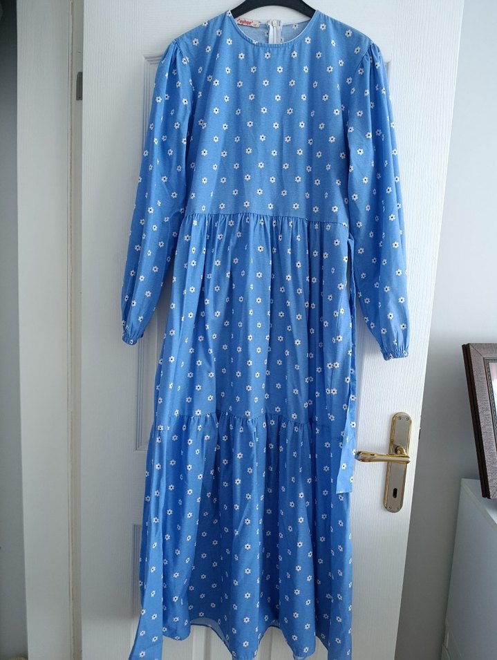 Bohem tarzda, uzun kollu, bol kesim, mavi pastel tonlarında, bağlama desenli, yuvarlak yakalı ve drapeli uzun elbise.