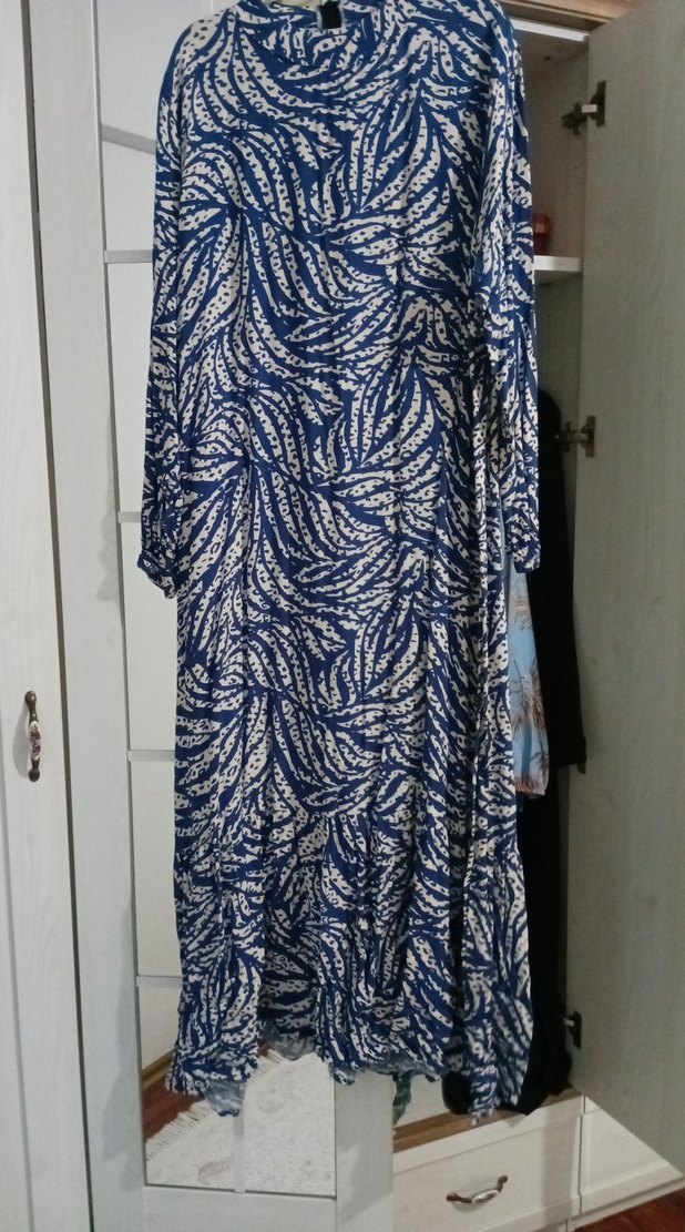Mavi bağlama desenli, uzun kollu, salaş kesim, bohem tarzda uzun elbise. Yumuşak sentetik kumaştan, kayık yaka ve dökümlü yapıda.