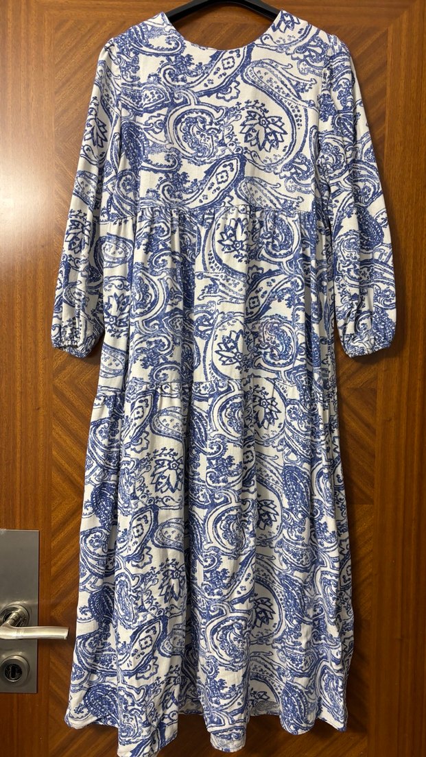 Mavi tie-dye paisley desenli, uzun kollu ve tekne yaka, bol kesim uzun elbise. Yumuşak sentetik kumaştan, günlük kullanıma uygun.