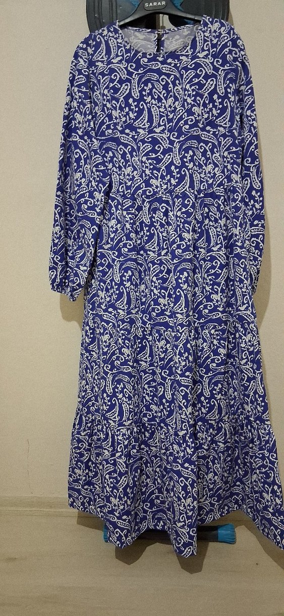Mavi bohem tarzda, bol kesim uzun kollu, V yaka uzun elbise. Renkli batik desen ve fırfır detaylarıyla, yumuşak sentetik kumaştan yapılmıştır.