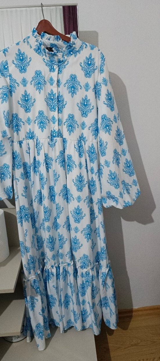 Mavi renkli, uzun kollu ve V yaka bohem elbise, bol kesim ve fırfır detaylıdır. Günlük kullanıma uygun yumuşak sentetik kumaştan üretilmiştir.