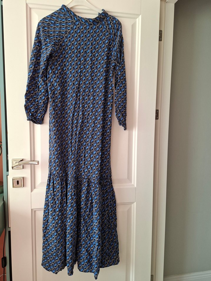 Koyu mavi renkte, uzun kollu, yüksek yakalı ve bol kesim piliseli elbise. Bağlama desenli, bohem tarzda.