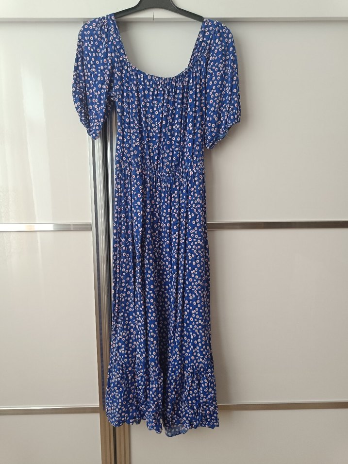 Mavi renkte, salaş kesimli, pileli detaylara sahip, askısız yaka ve yumuşak sentetik kumaştan yapılmış bohem tarzda uzun elbise.
