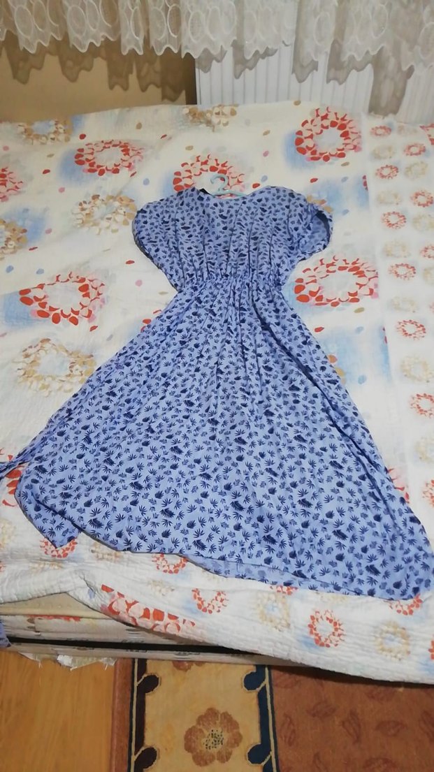 Mavi, uzun boylu elbise, kısa kollu ve V yakalıdır. Yumuşak sentetik kumaştan yapılmış, salaş kesim ve hafif batik desenlidir. Bohem ve vintage tarzı yansıtır.