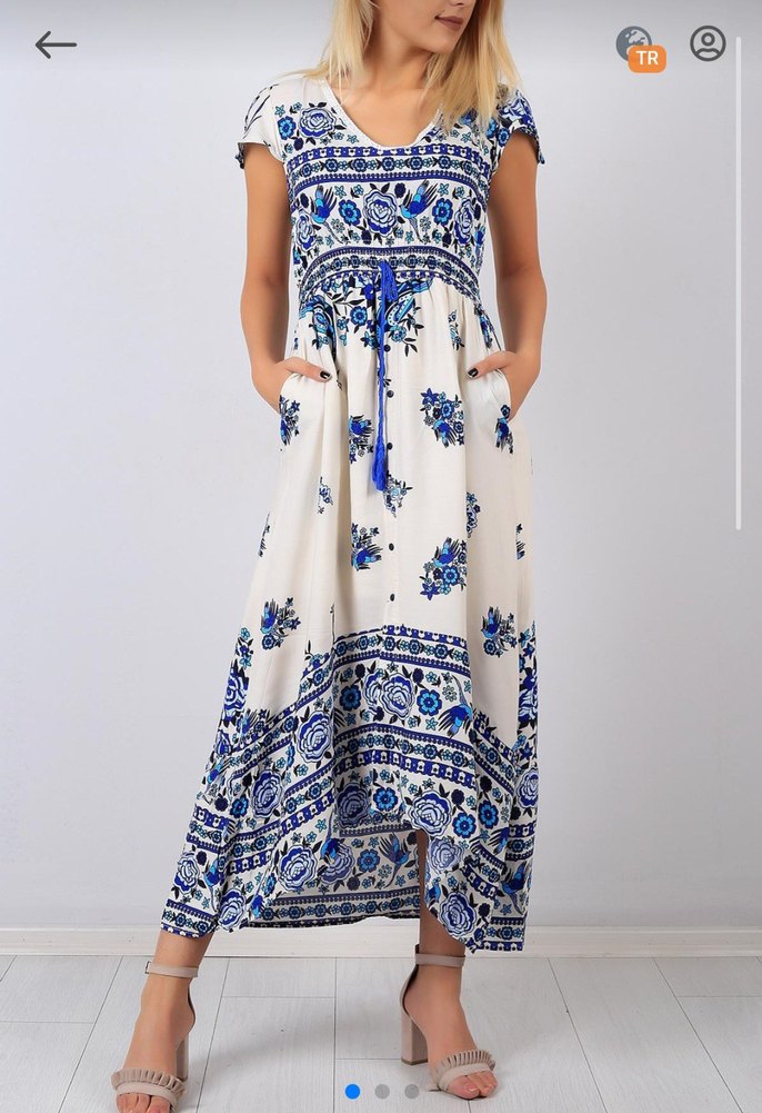 V yaka, kısa kollu, alt bölümü bol kesim uzun elbise. Mavi çiçekli ve tavuskus desenli, dantel detaylı, yumuşak pamuk tekstil kumaştan yapılmıştır. Bel kısmındaki lastikleri biraz eskimiş kullanıma engel değil, bunu bilerek alınız, bunun haricinde sorunsuz tertemiz üründür. Krem rengindedir. Etek kısmı astarlıdır. yanda cepleri vardir. Severek kullanıyordum dar geldiği için satıştadır. 38-40 bedene uygundur.