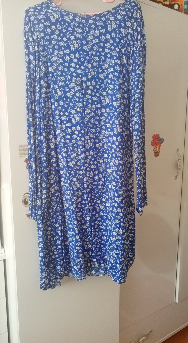 Mavi uzun elbise, bol kesim ve uzun kollu olup V yakaya sahiptir. Yumuşak sentetik kumaştan yapılmış, açık tonlu batik desenlidir. Drapeli tasarımıyla rahat bir bohem tarz sunar.