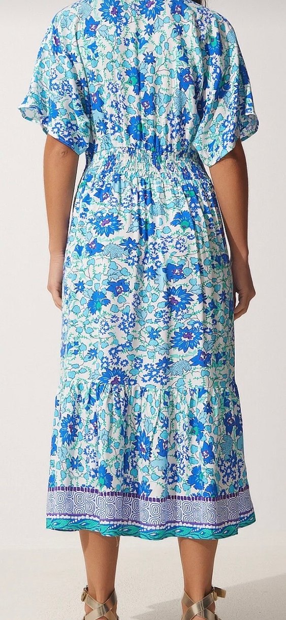 Mavi bohem tarzda, V yakalı, fırfırlı ve bol kesimli uzun elbise. Pamuklu kumaştan, askılı kollu, romantik akşamlar için uygundur. Butik ürün sıfırdır