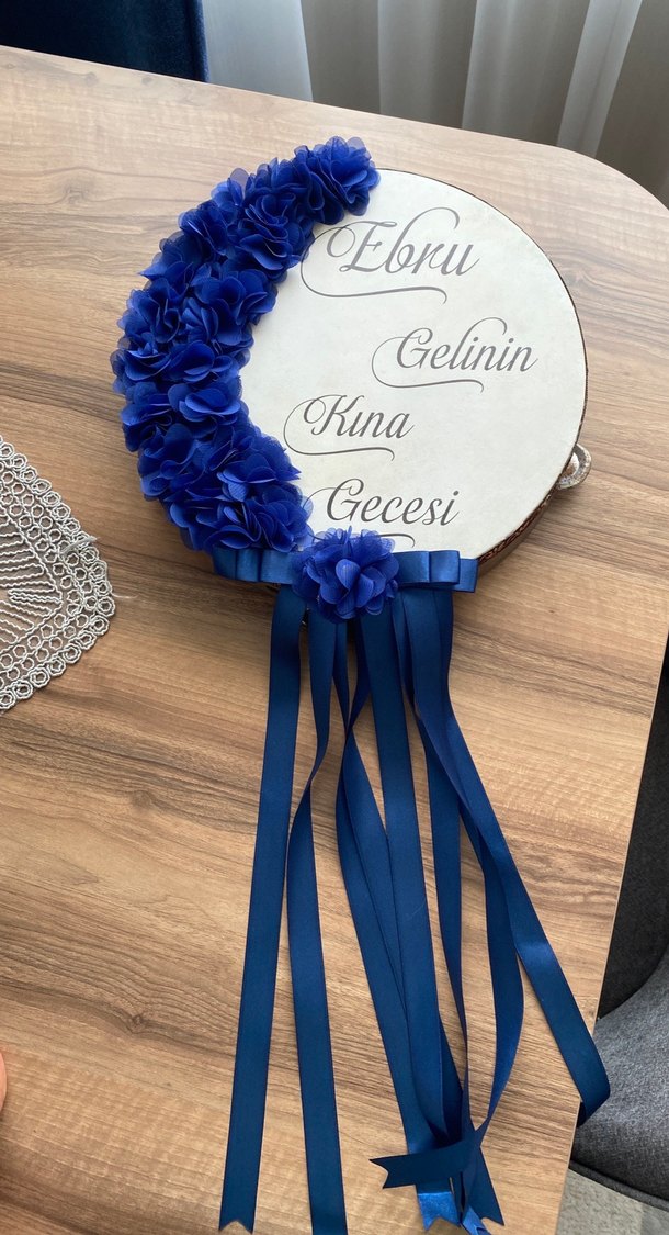 Mavi parlak kurdeleler ve çiçek detaylarıyla bohem vintage tarzda, "Ebru Gelinin Kına Gecesi" yazılı kına tefi