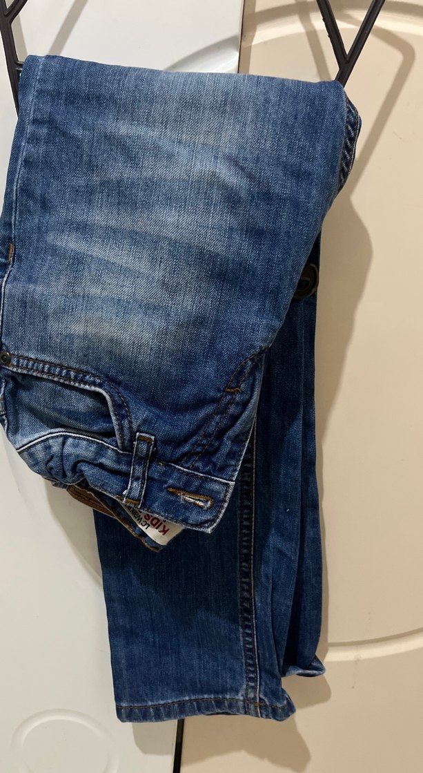 Mavi kot pantolon, bol kesim ve tokalı detaylara sahiptir. Günlük kullanım ve sokak stili için uygundur, parlak renklidir.