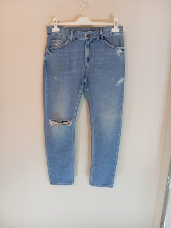 Mavi denim kumaştan, bol kesim ve midi boy pantolon. Hafif yırtık detaylı, günlük ve sokak stiline uygun rahat tasarım. bel 42 cm boy 102 cm paça 16 cm dir.