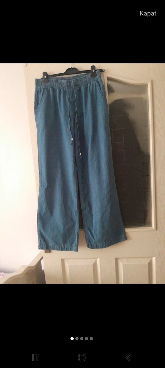 Mavi renkte, bol kesim ve kemerli bel detaylı denim pantolon. Midi boyda, desensiz, gündelik kullanıma uygun normcore tarzında.