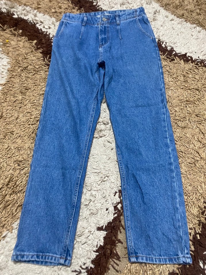 Mavi, bol kesim ve normal boyda kadın denim pantolon. Desensiz, günlük kullanım için rahat ve şık bir sokak stili sunar.