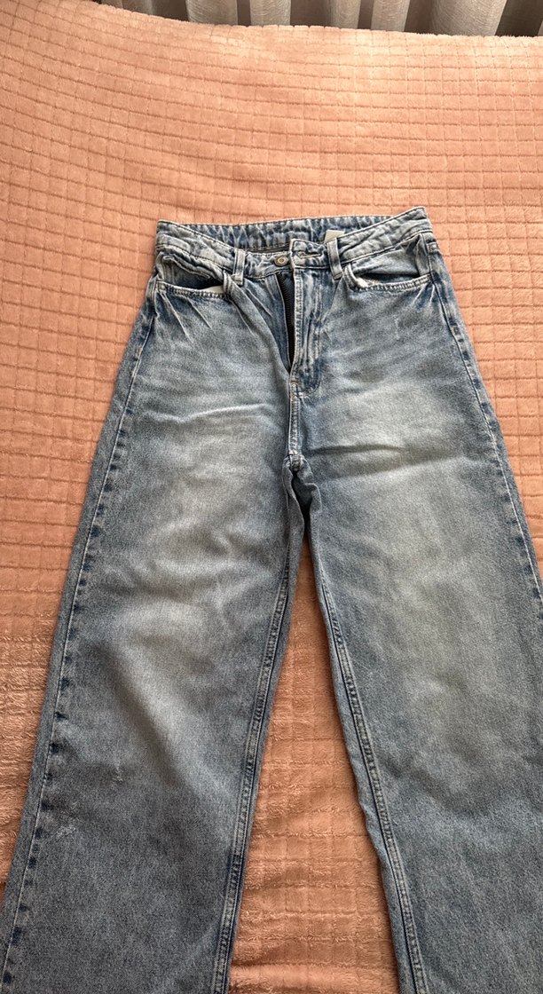 Mavi renkli, bol kesim ve normal boyda kadın denim pantolon. Günlük kullanım için rahat