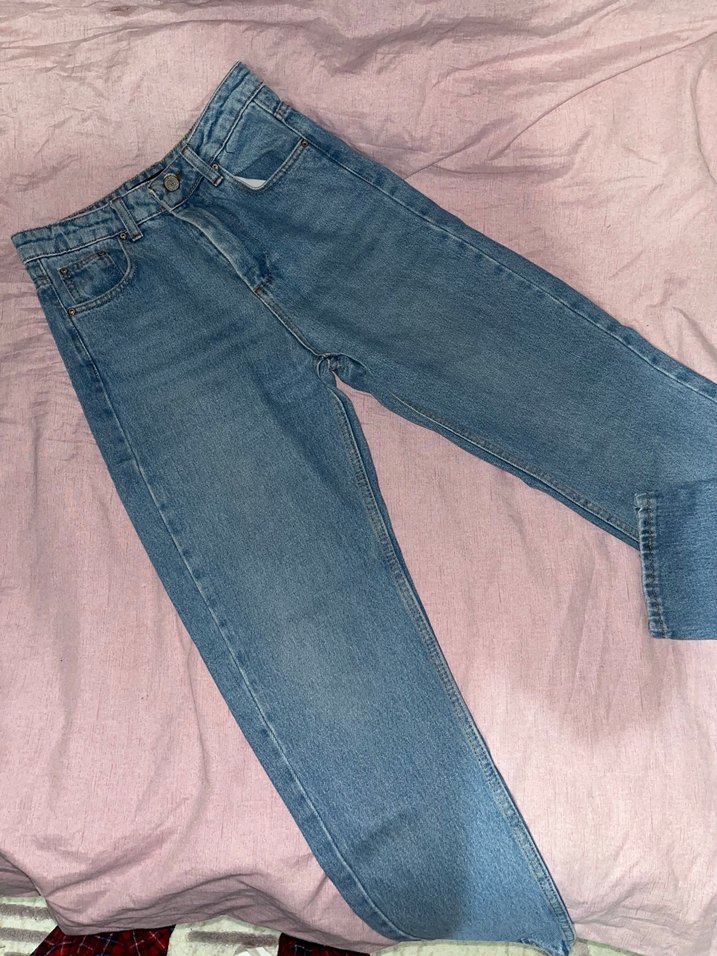 Mavi renkte, bol kesim kadın kot pantolon. Günlük rahat kullanıma uygun, sade ve şık bir görünüm sunar.