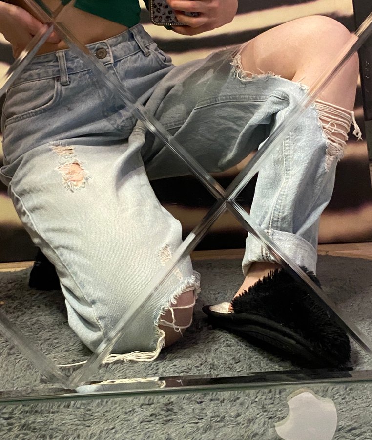 Mavi renkte, bol kesim, yırtık detaylı kot pantolon. Tokalı ve midi boy, günlük kullanıma uygun parlak görünümlü parça.