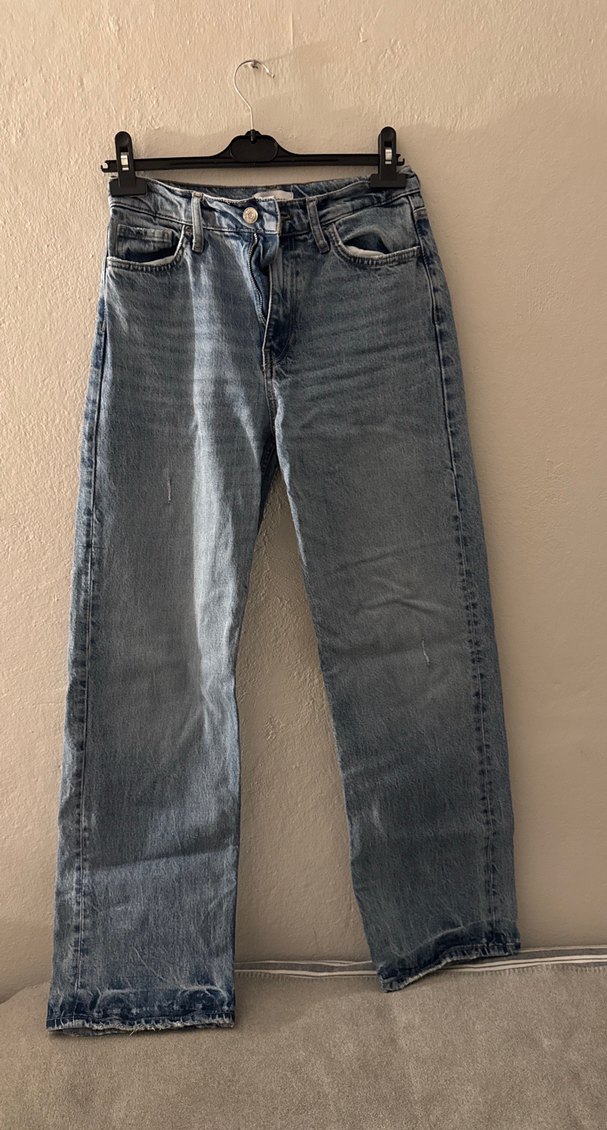 Mavi kot pantolon, rahat kesim ve normal midi boyda. Günlük kullanım için desensiz, rahat ve şık bir görünüm sunar.