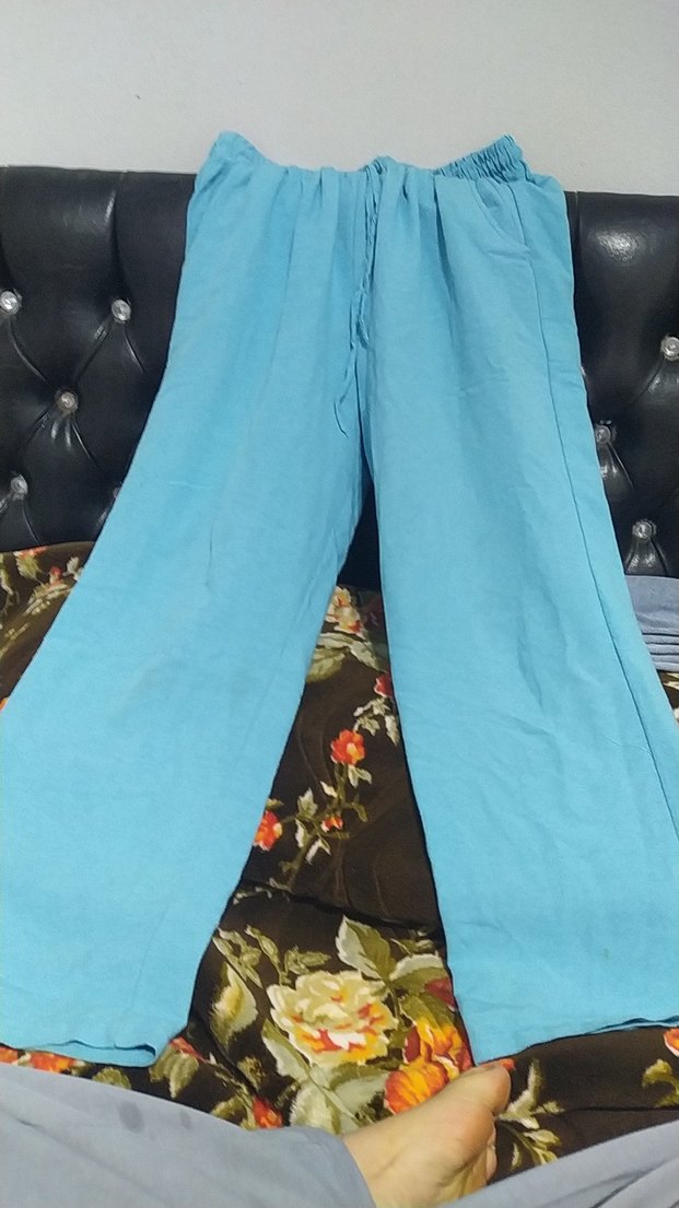Mavi, bol kesim, pileli uzun kadın pantolonu. Yumuşak sentetik kumaştan, bohem tarzda, günlük açık hava kullanımı için uygundur.