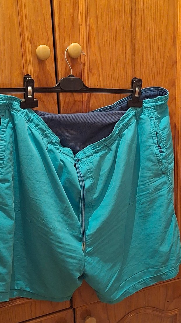 Parlak mavi renkte, kemerli ve bol kesim erkek deniz şortu, normal midi boyda, plaj ve sokak stili için uygundur.