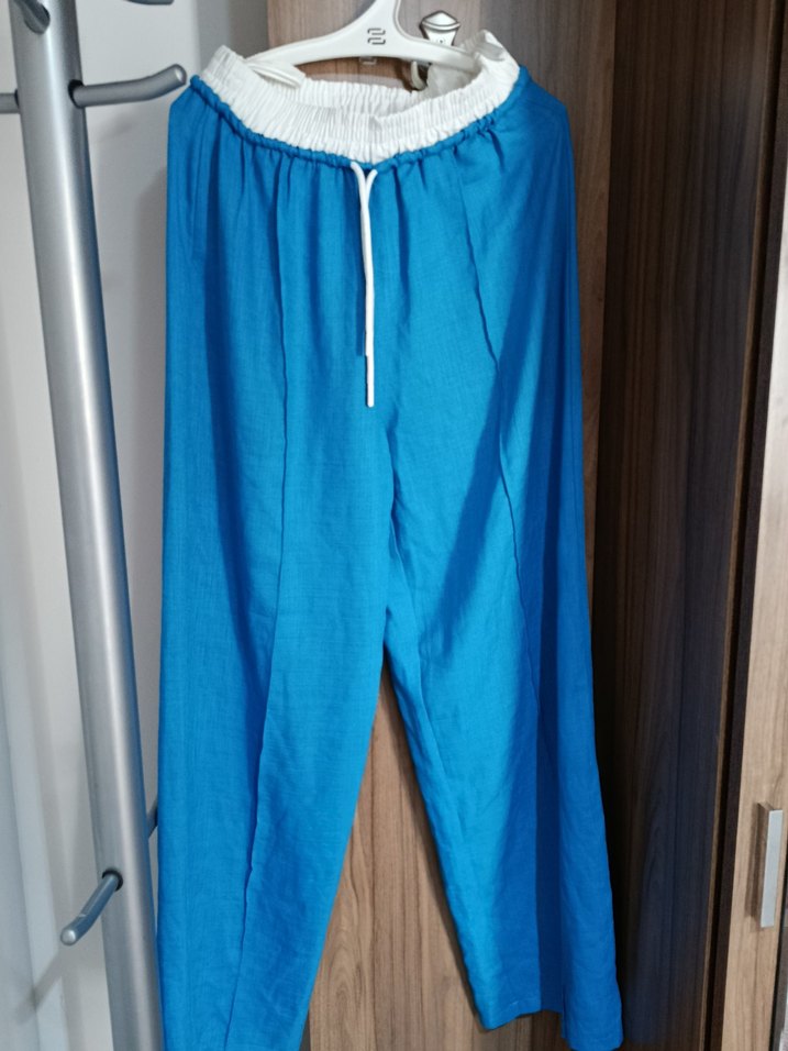 Beyaz lastikli ve bağcıklı bel detayına sahip, rahat ve bol kesim mavi keten pantolon. Günlük kullanıma uygun, trend ve rahat bir stil sunar.