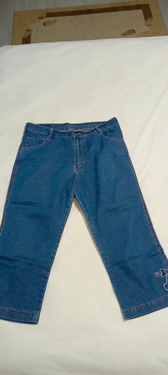 Mavi denim kumaştan, bol kesim ve midi boyda, rahat ve şık bir günlük kadın kot pantolon.